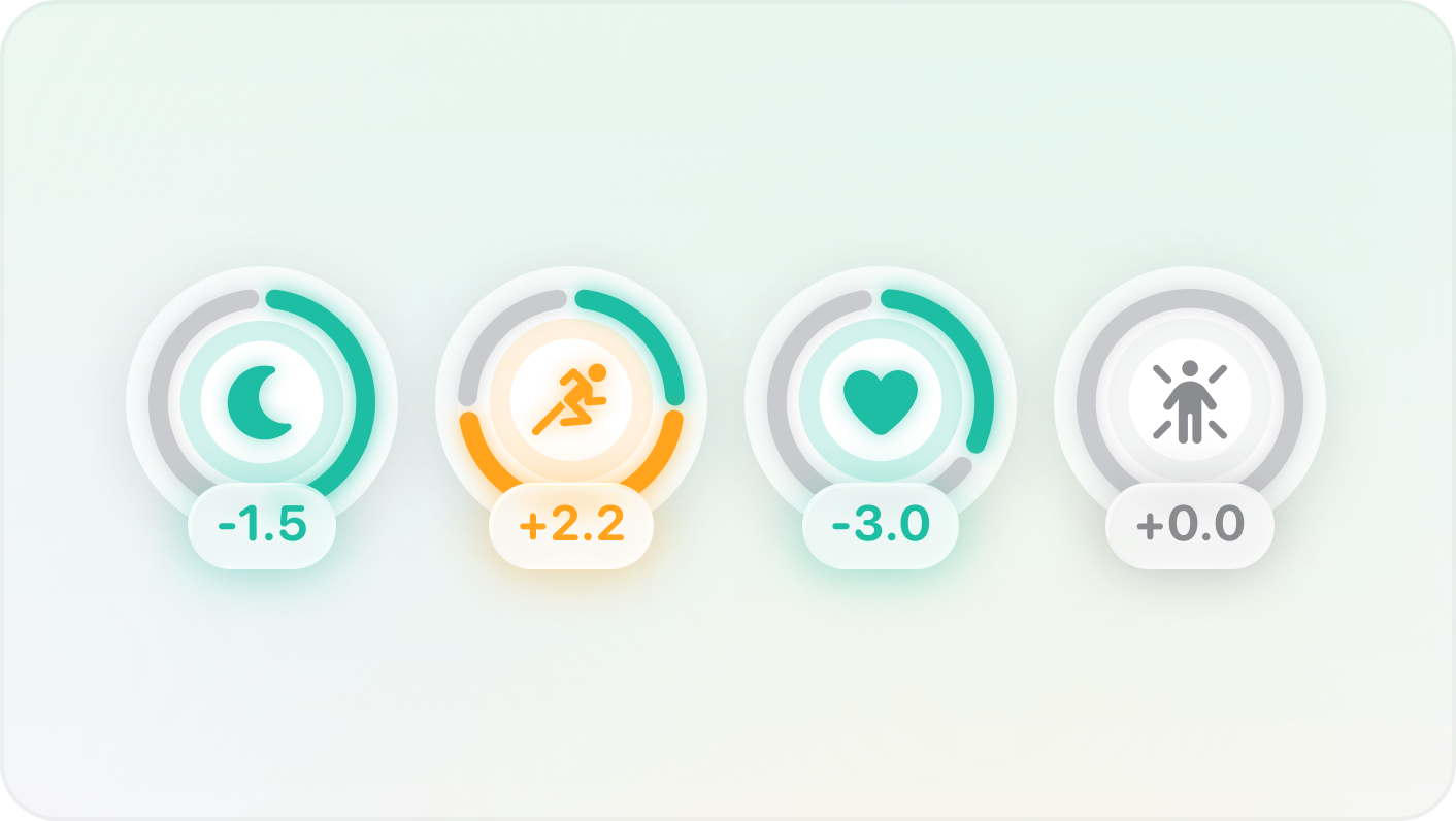 Many factors in the model overlap; they're measuring related aspects of the same underlying biology. Resting Heart Rate and VO₂ Max both reflect cardiovascular fitness. Glucose and Nutrition Score are biologically linked. Lean Body Mass and Strength Training are cause and effect. If the model treated each independently, it would double-count these relationships and overstate the total impact. Instead, Bevel accounts for this covariance, so the combined effect is appropriately moderated.
