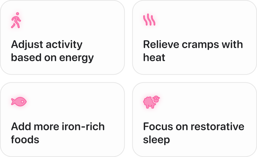 • Nutrition: Monitor iron intake to support recovery, especially if you experience heavy bleeding (Pedlar et al., 2018).